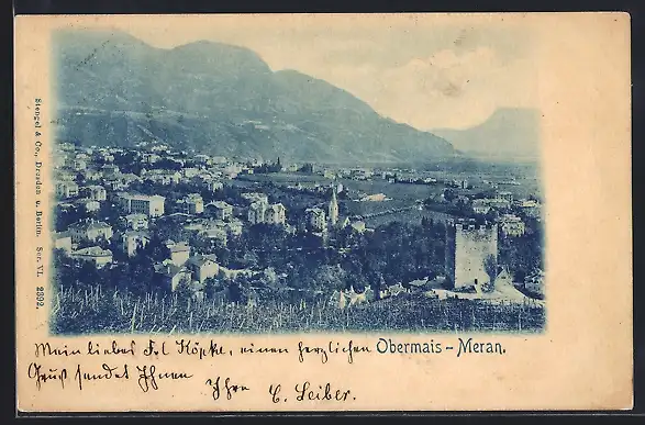 AK Obermais-Meran, Gesamtansicht aus der Vogelschau