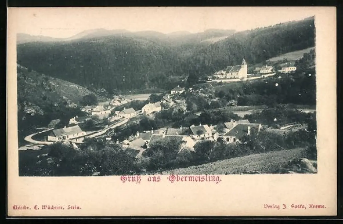 AK Obermeisling, Ortsansicht von einem Hügel aus