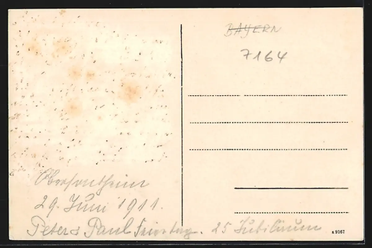 Personenbezogene Daten auf der Rückseite der Karte wurden durch blauen Textmarker unkenntlich gemacht. Die blauen Stellen sind auf die Vorderseite durchgeweicht und wirken sich negativ auf das Postkartenfoto aus