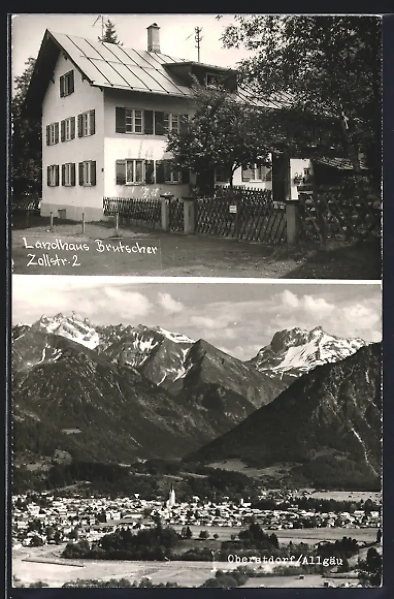 AK Oberstdorf /Allgäu, Landhaus Burtscher, Ortsansicht, Alpenpanorama