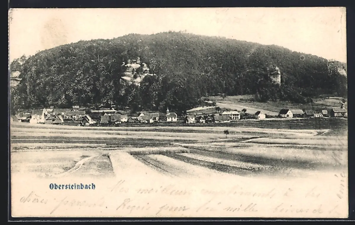 AK Obersteinbach, Vue du village avec forêt et collines en arrière-plan