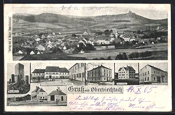 AK Oberviechtach, Amtsgericht, Bahnhof, Marktplatz, Ortsansicht