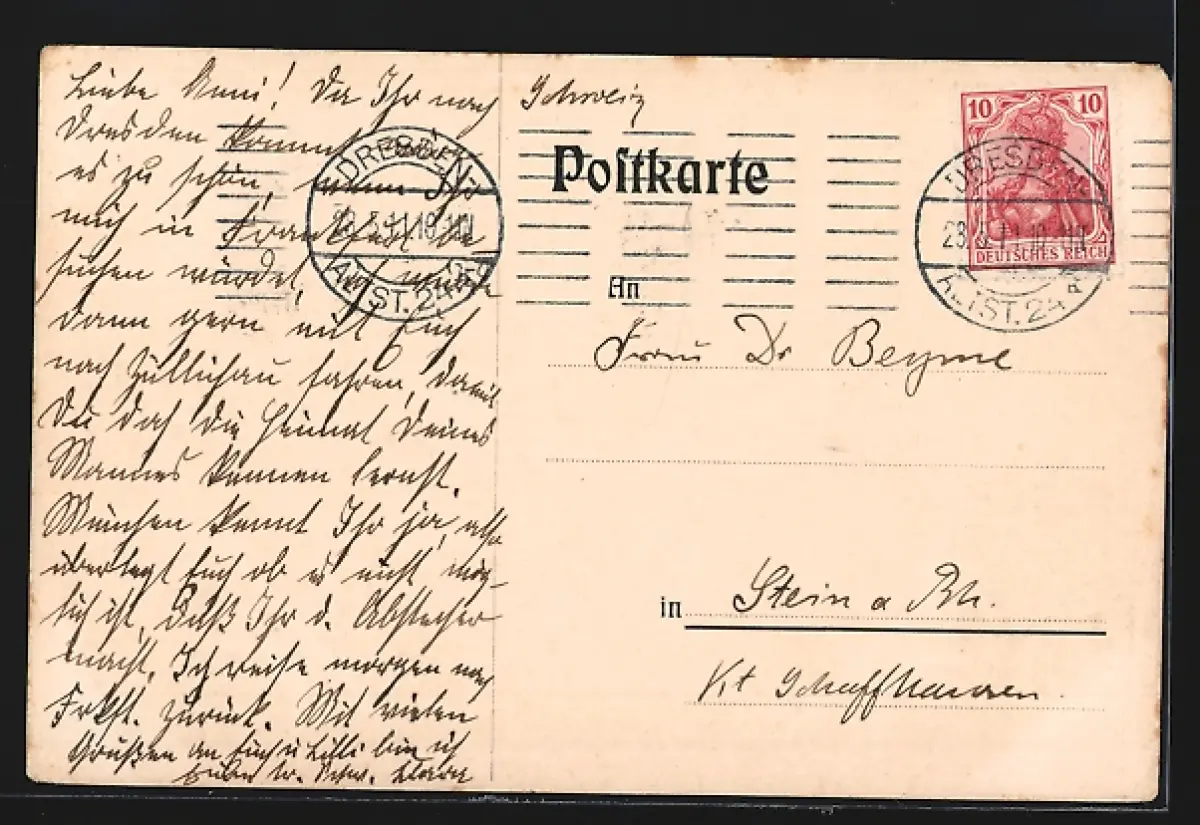 alte Ansichtskarte, gelaufen 1911, Eckknicke re., Stempelspur, minimaler Eckschaden li. oben