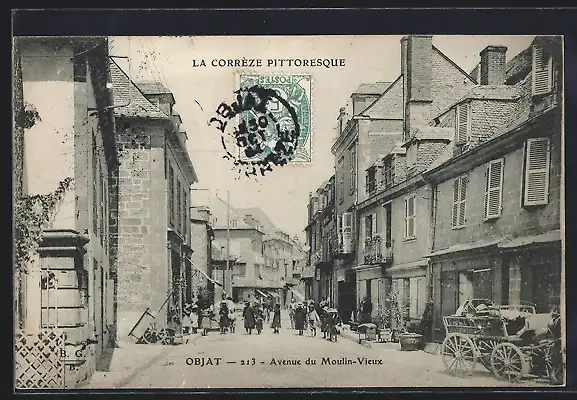 AK Objat, Avenue du Moulin-Vieux animée avec calèche et passants