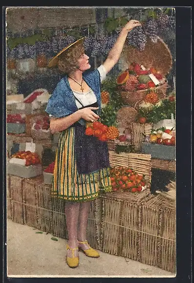 AK Obstverkäuferin mit Weintrauben und Pfirsichen