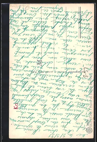 Personenbezogene Daten auf der Rückseite der Karte wurden durch blauen Textmarker unkenntlich gemacht. Die blauen Stellen sind auf die Vorderseite durchgeweicht und wirken sich negativ auf das Postkartenfoto aus
