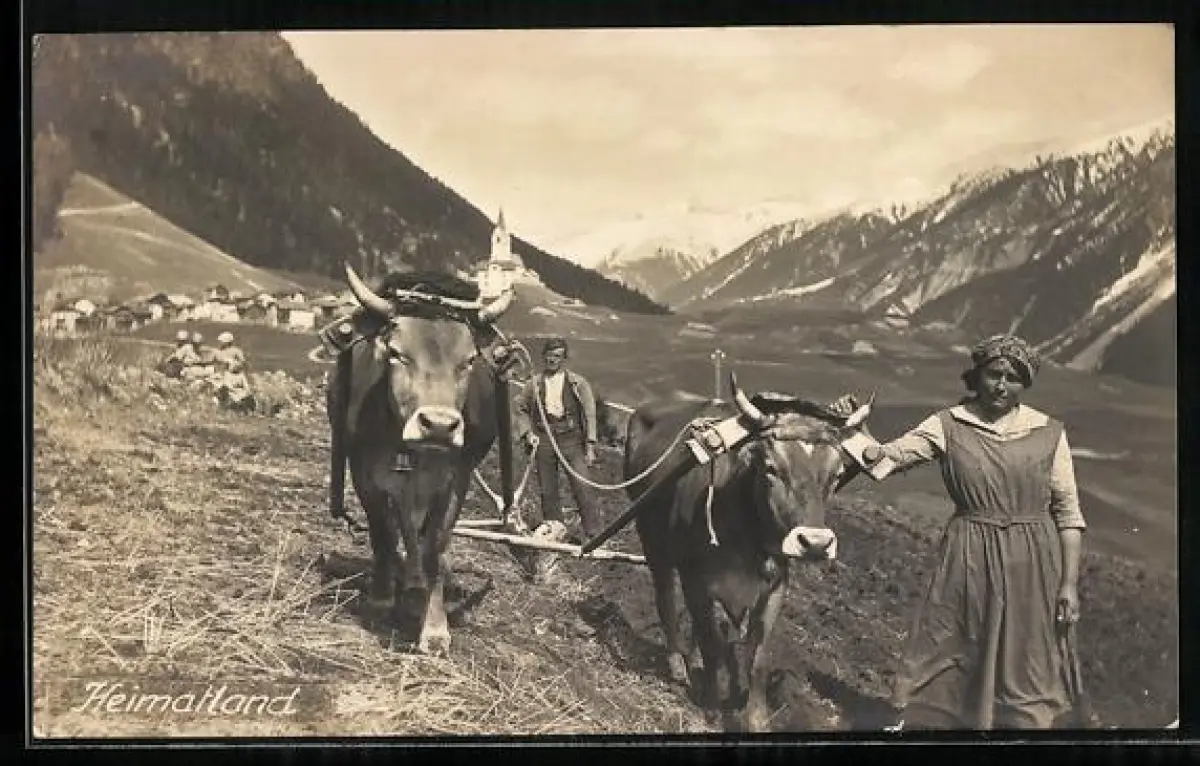 AK Ochsen-Gespann beim Pflügen des Felds in den Bergen