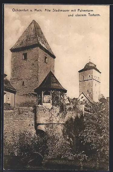 AK Ochsenfurt a. Main, Alte Stadtmauer mit Pulverturm und oberem Torturm
