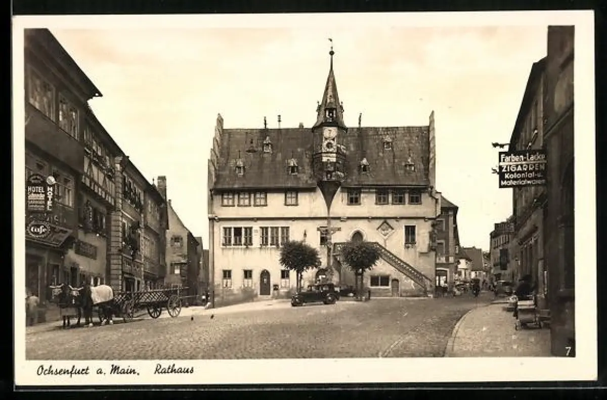 AK Ochsenfurt a. Main, Blick auf das Rathaus, Hotel Schnecke, Geschäft für Kolonialwaren