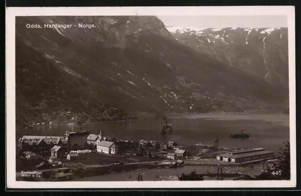 AK Odda, Totalansicht mit Fjordpanorama, Dampfer