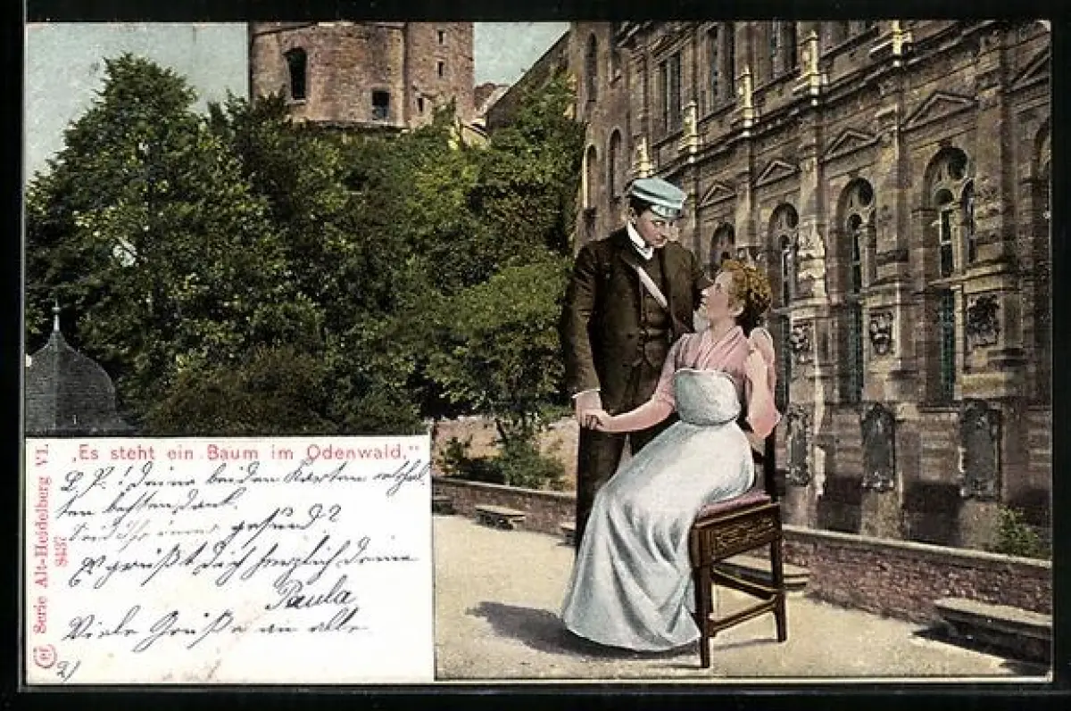 AK Odenwald, Liebespaar, Frau auf einem Stuhl sitzend, Mann hält ihre Hand, studentische Szene