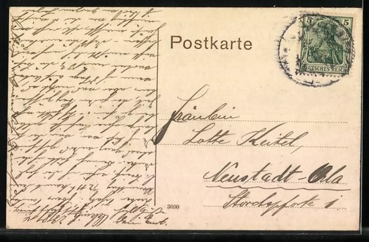 Personenbezogene Daten auf der Rückseite der Karte wurden durch blauen Textmarker unkenntlich gemacht. Die blauen Stellen sind auf die Vorderseite durchgeweicht und wirken sich negativ auf das Postkartenfoto aus
