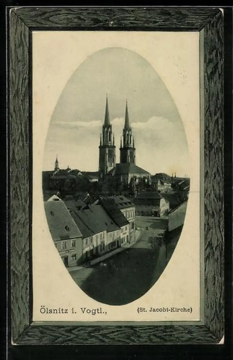 AK Ölsnitz i. Vogtl., St. Jacobi-Kirche im Passepartout-Rahmen