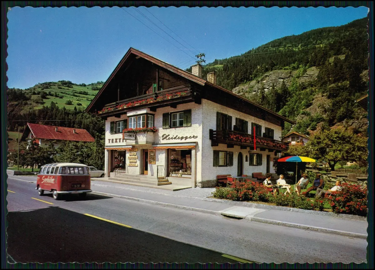 AK Oetz im Ötztal Tirol - Haus Heidegger mit Textilgeschäft - Volkswagen T1 Bus