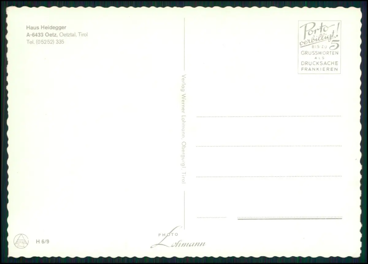 Oetz Tirol Haus Heidegger Textilgeschäft Pension Alpenpanorama koloriert Kolorit Oetz im Ötztal in Tirol zeigt auf dieser kolorierten Karte das Haus Heidegger mit Textilgeschäft, Gästezimmern und Gartenbereich vor alpiner Kulisse. Oetz ist ein traditionsreicher Ort am Eingang des Ötztals und bekannt für seine Lage zwischen Acherkogel und Piburger See. Die Aufnahme wirkt lebendig durch das Gebäude im typischen Tiroler Stil mit Blumenschmuck, einem vorbeifahrenden Bus und Sommergästen im Garten. Rückseite sauber mit Hinweis Haus Heidegger A 6433 Oetz Ötztal Tirol sowie Verlagsangabe Verlag Werner Lohmann Obergurgl Tirol. Zustand sehr gut klarer Druck frische Farben leichte altersbedingte Spuren.