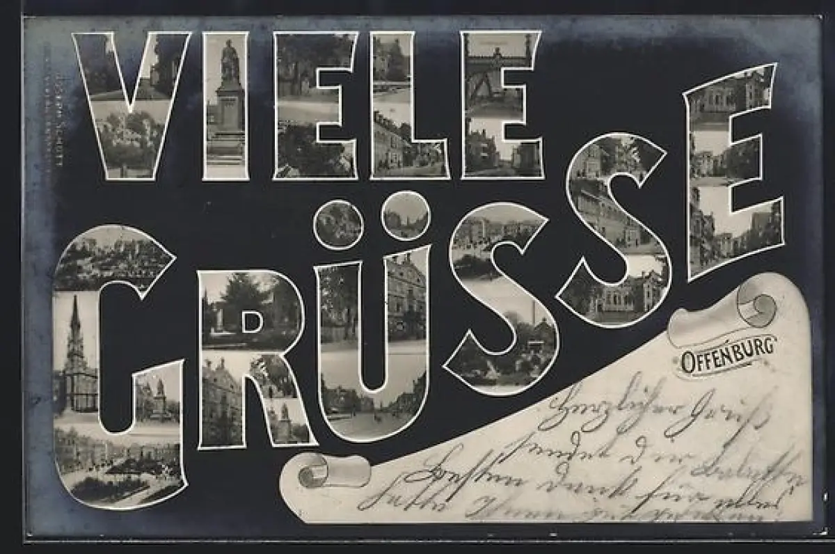 AK Offenburg, Schriftzug Viele Grüsse mit Denkmal, Kirche und Strassenpartie