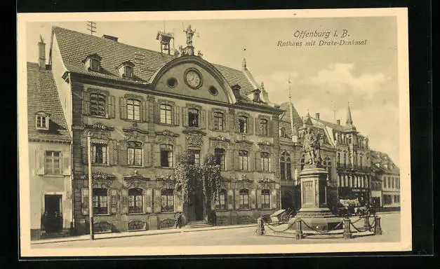 AK Offenburg i. B., Rathaus mit Drake-Denkmal
