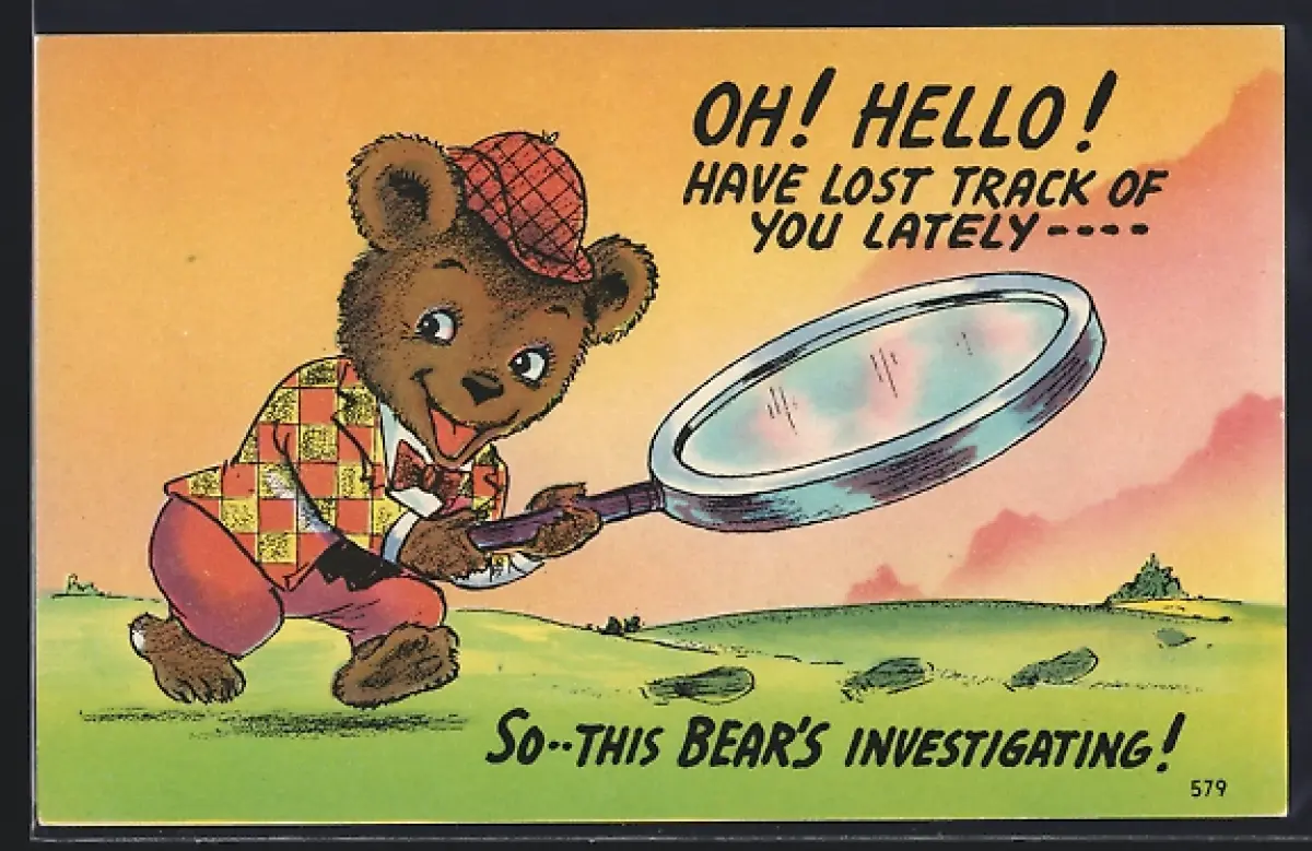 AK Oh! Hello! Have lost track of you lately..., Bär als Detektiv sucht mit grosser Lupe nach Fussspuren