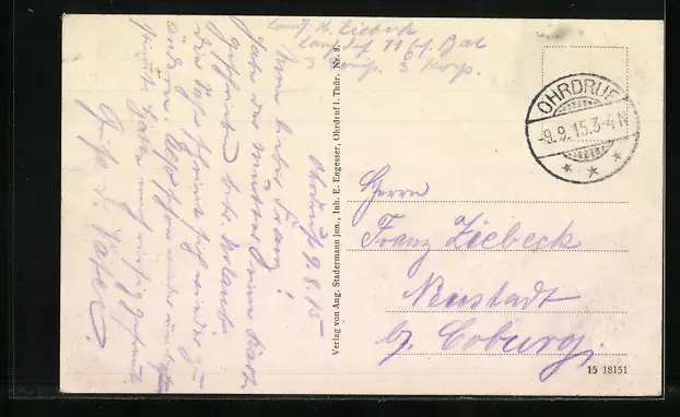 Personenbezogene Daten auf der Rückseite der Karte wurden durch blauen Textmarker unkenntlich gemacht. Die blauen Stellen sind auf die Vorderseite durchgeweicht und wirken sich negativ auf das Postkartenfoto aus