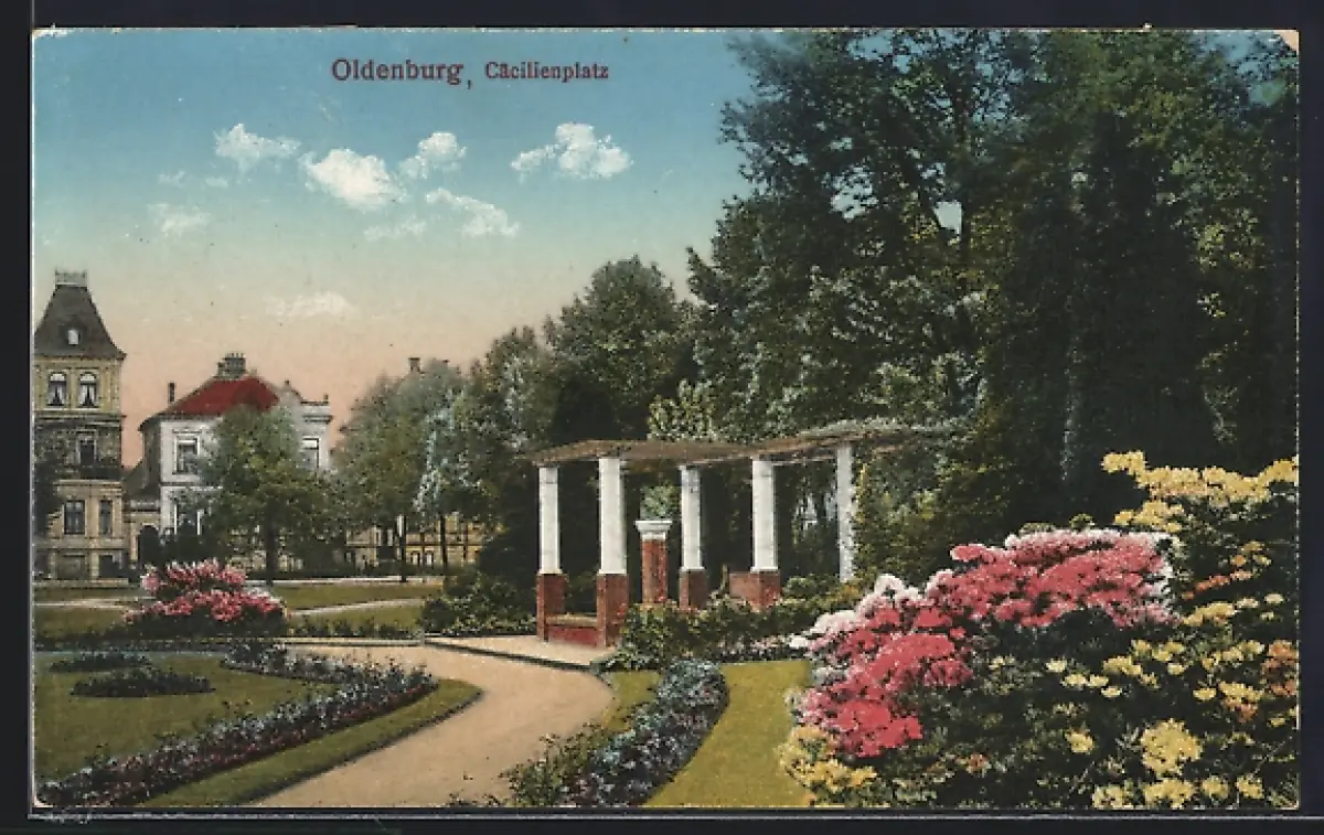 AK Oldenburg / O., Cäcilienplatz, Pavillon und prächtige Blumenbeete