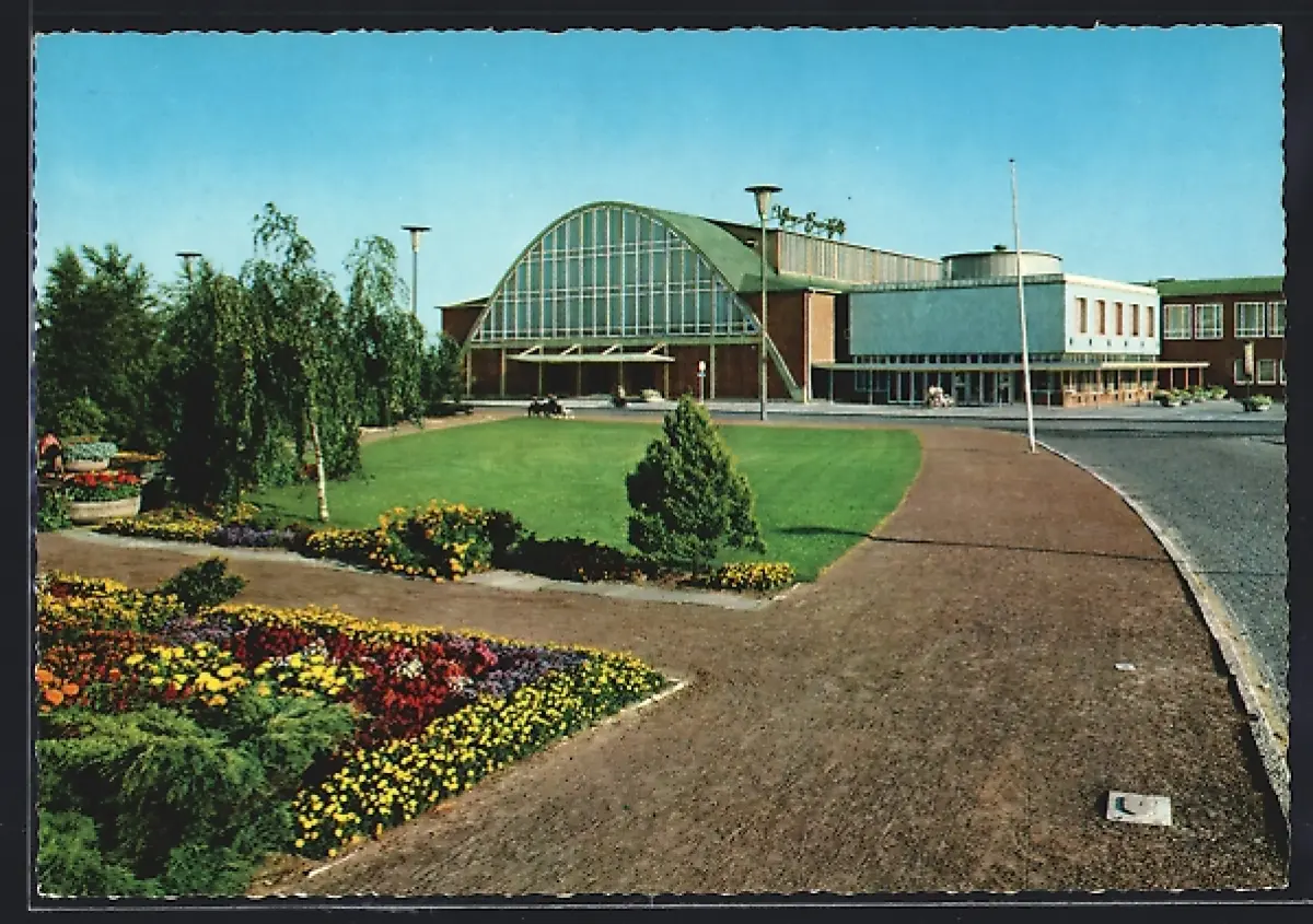 AK Oldenburg / O., Die Weser-Ems-Halle mit Gartenanlage