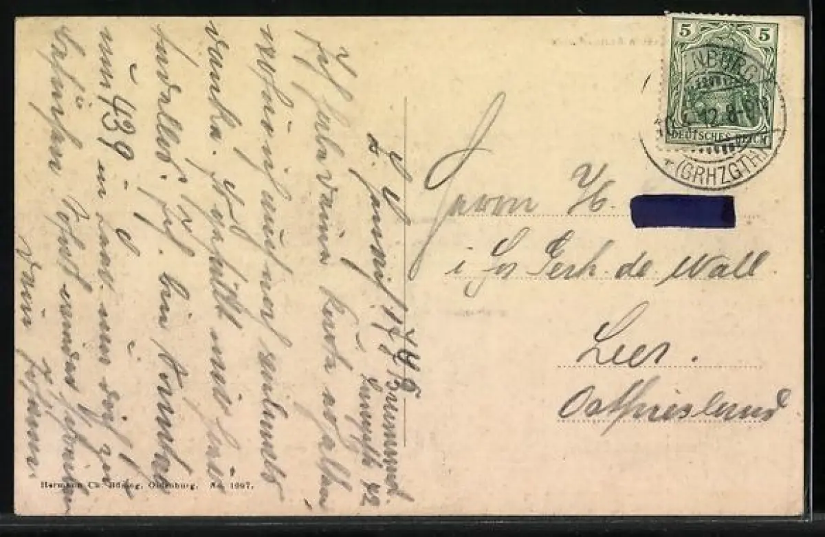 Personenbezogene Daten auf der Rückseite der Karte wurden durch blauen Textmarker unkenntlich gemacht. Die blauen Stellen sind auf die Vorderseite durchgeweicht und wirken sich negativ auf das Postkartenfoto aus