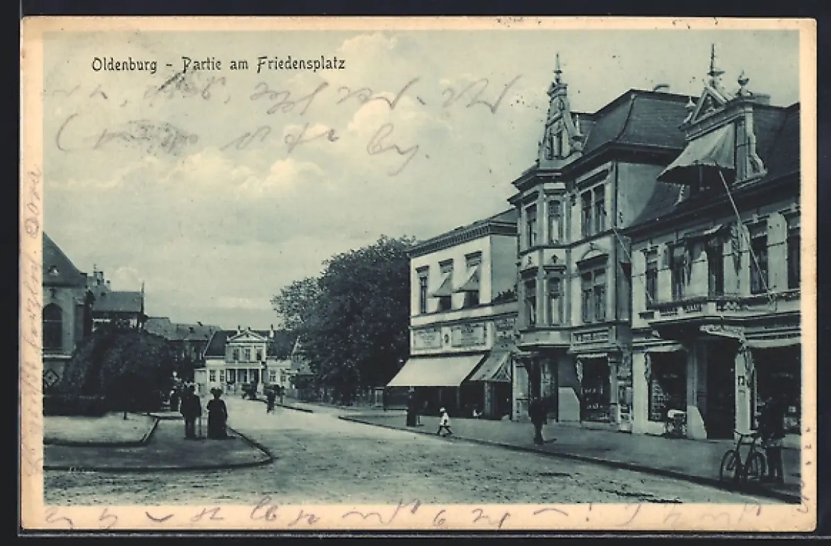 AK Oldenburg / O., Friedensplatz, Ortspartie mit Kirche, Abzweig, Strasse u. Geschäften