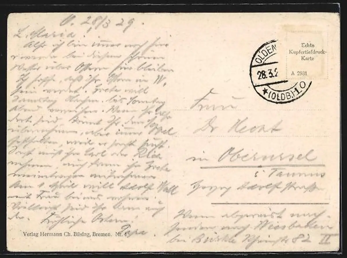alte Ansichtskarte, gelaufen 1929, Briefmarke entfernt, Bugspur oben mittig, guter Zustand