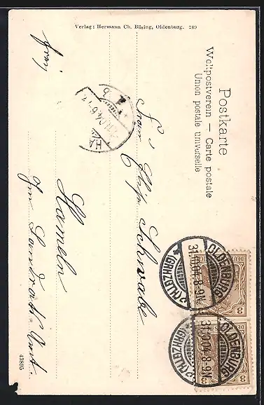 alte Ansichtskarte, gelaufen 1904, Eckknick re. oben, minimaler Eckschaden re. unten