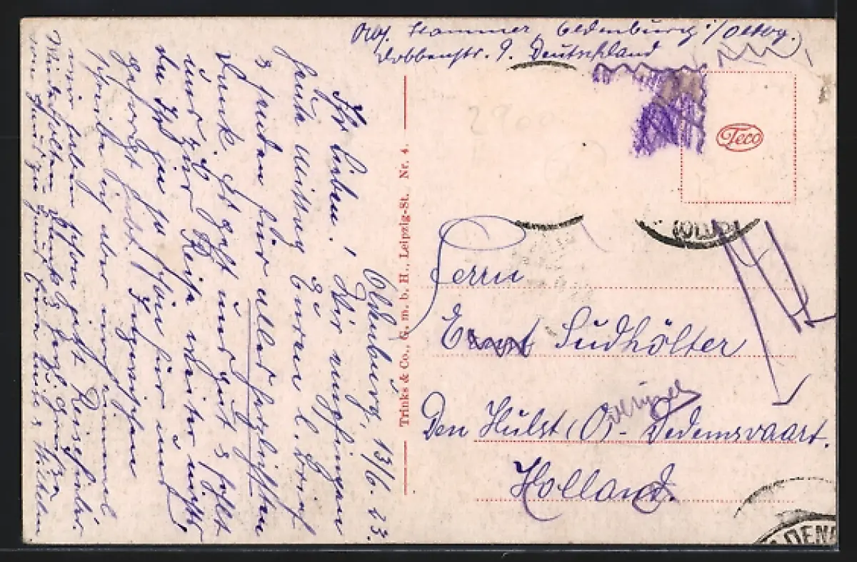 alte Ansichtskarte, gelaufen, Briefmarke entfernt, guter Zustand