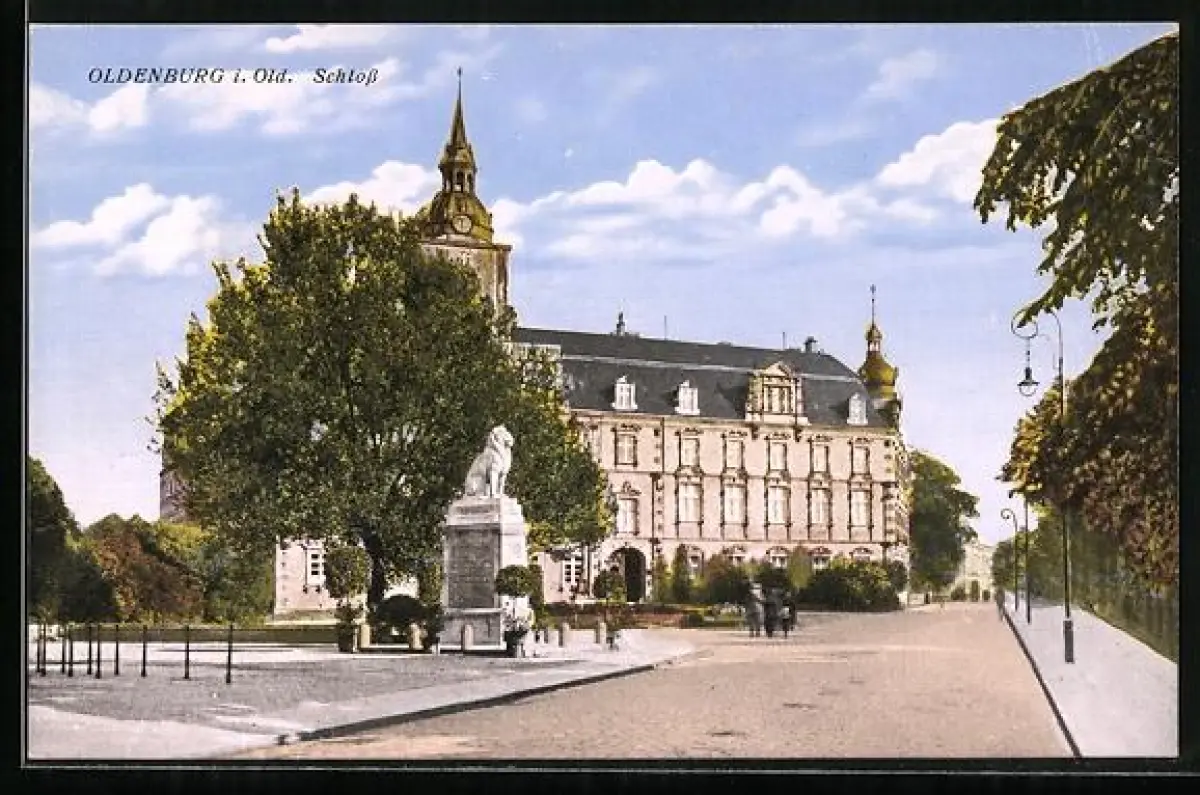 AK Oldenburg i. Old., Schloss mit Denkmal und Strassenpartie