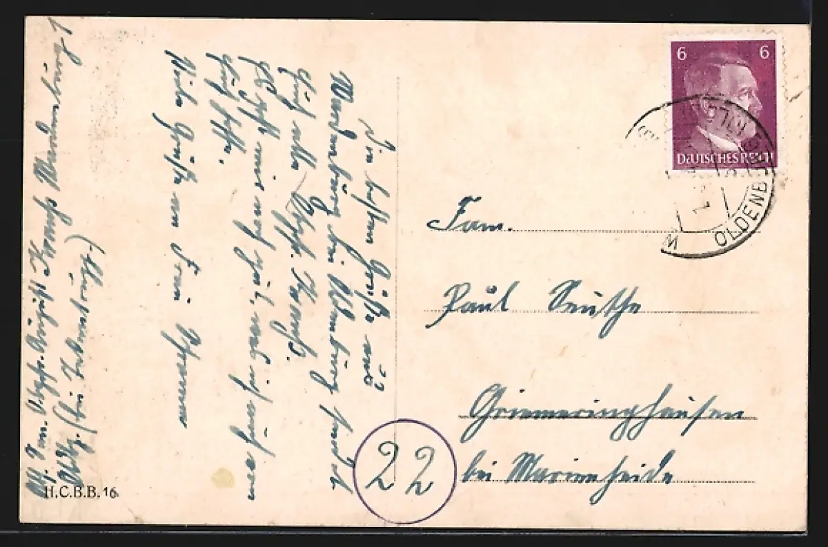 Personenbezogene Daten auf der Rückseite der Karte wurden durch blauen Textmarker unkenntlich gemacht. Die blauen Stellen sind auf die Vorderseite durchgeweicht und wirken sich negativ auf das Postkartenfoto aus