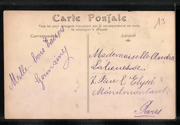 Personenbezogene Daten auf der Rückseite der Karte wurden durch blauen Textmarker unkenntlich gemacht. Die blauen Stellen sind auf die Vorderseite durchgeweicht und wirken sich negativ auf das Postkartenfoto aus