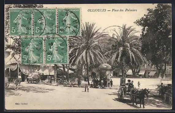 AK Ollioules, Place des Palmiers avec calèches et palmiers majestueux