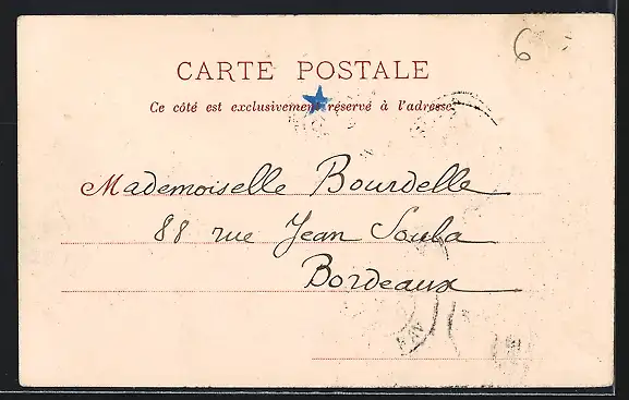 Personenbezogene Daten auf der Rückseite der Karte wurden durch blauen Textmarker unkenntlich gemacht. Die blauen Stellen sind auf die Vorderseite durchgeweicht und wirken sich negativ auf das Postkartenfoto aus