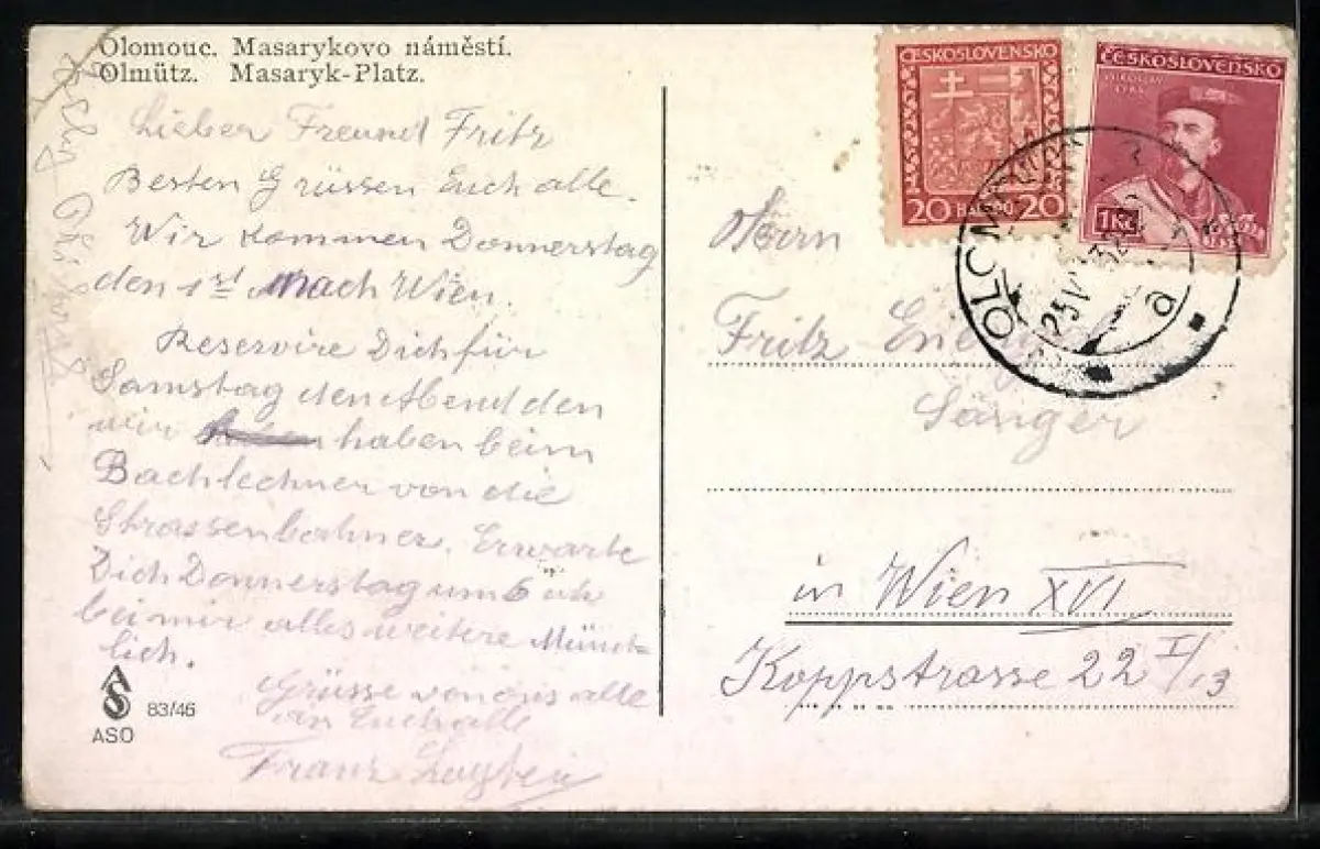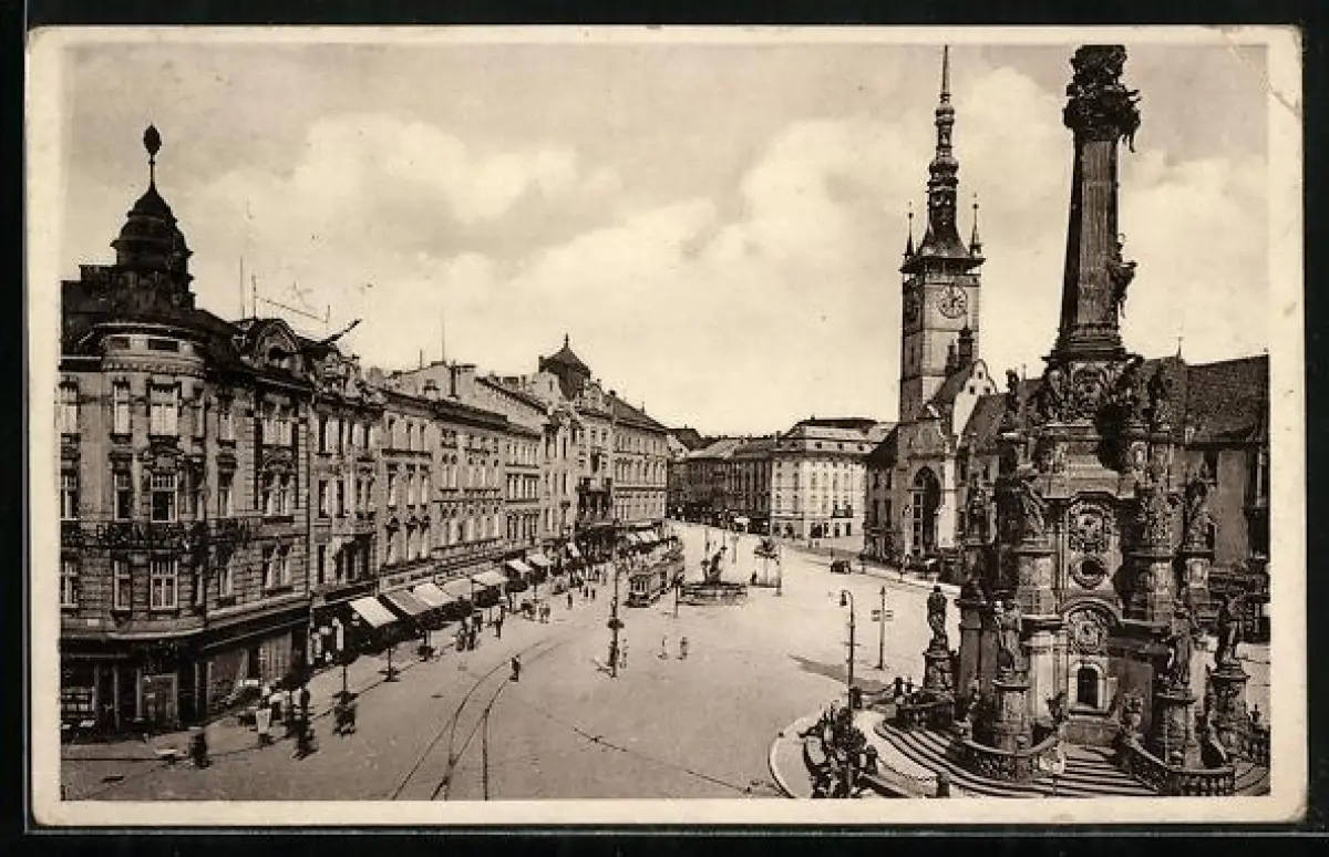 AK Olmütz, Masaryk-Platz mit Strassenbahn aus der Vogelschau