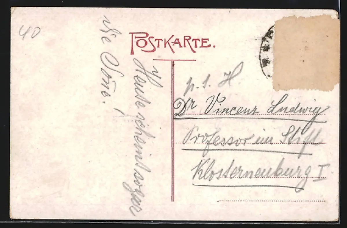 alte Ansichtskarte, gelaufen 1909, Briefmarke entfernt, rückseitig Oberflächenschaden, Bugspur li. oben, guter Zustand