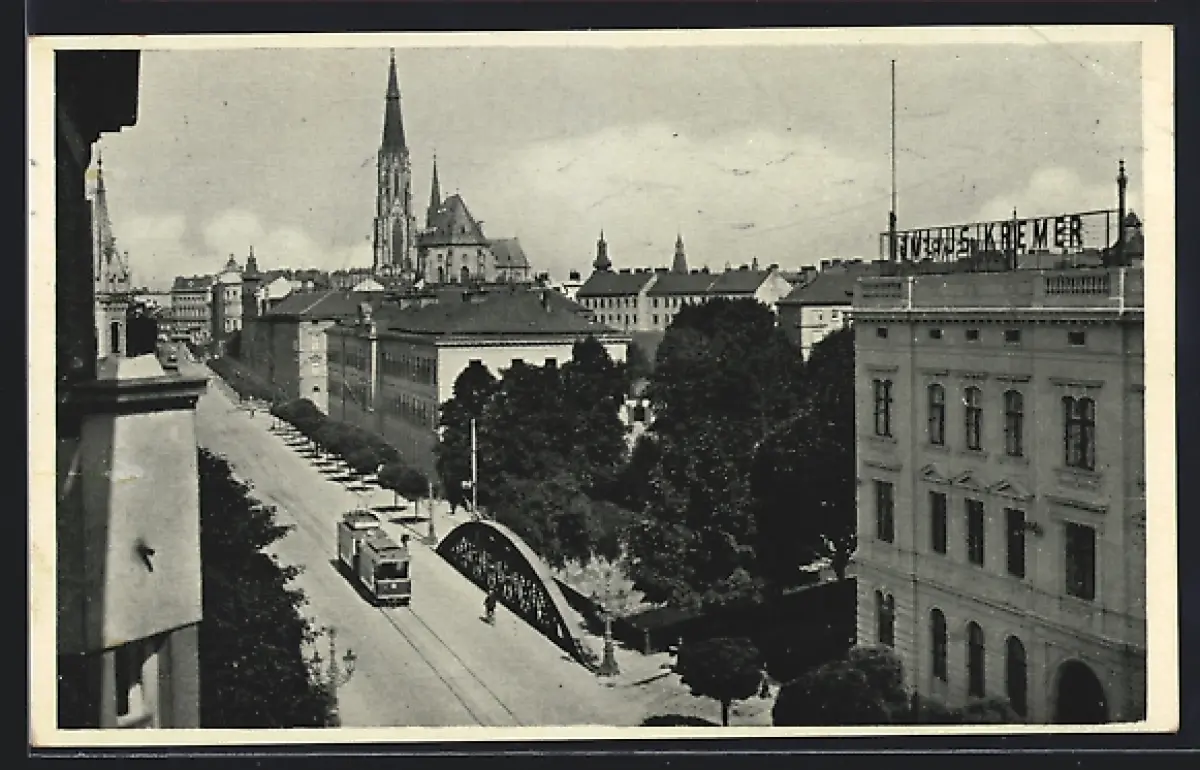 AK Olmütz, Strassenpartie mit Kirche und Strassenbahn