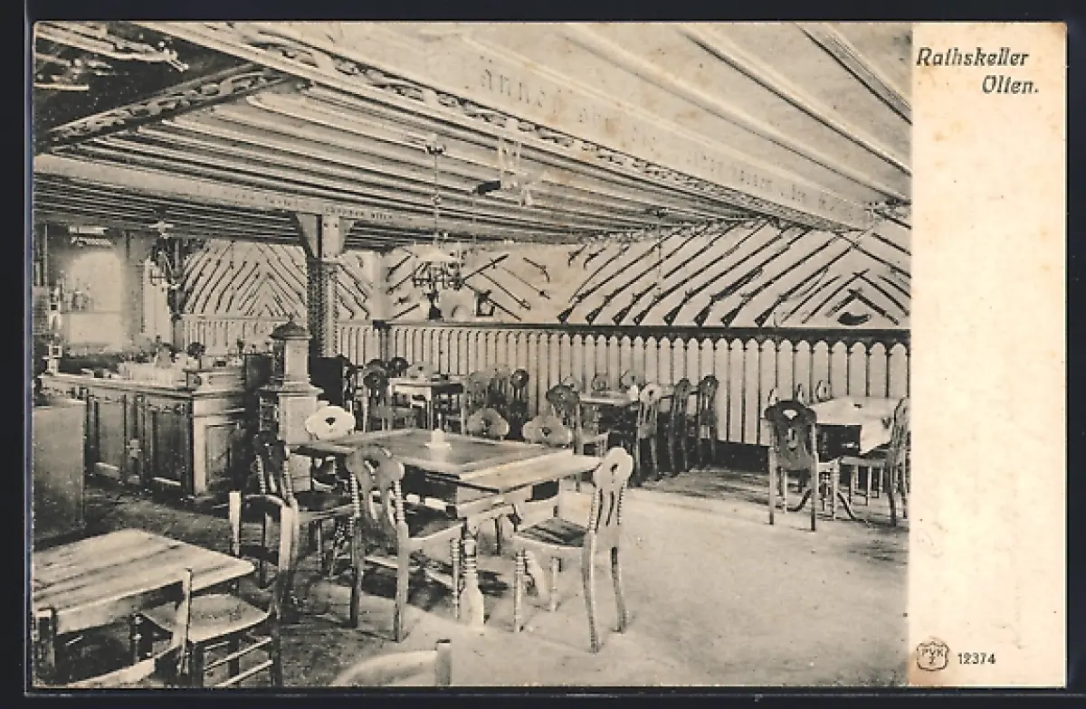 AK Olten, Reataurant Rathskeller Olten, Innenansicht Speisesaal mit historischen Waffen