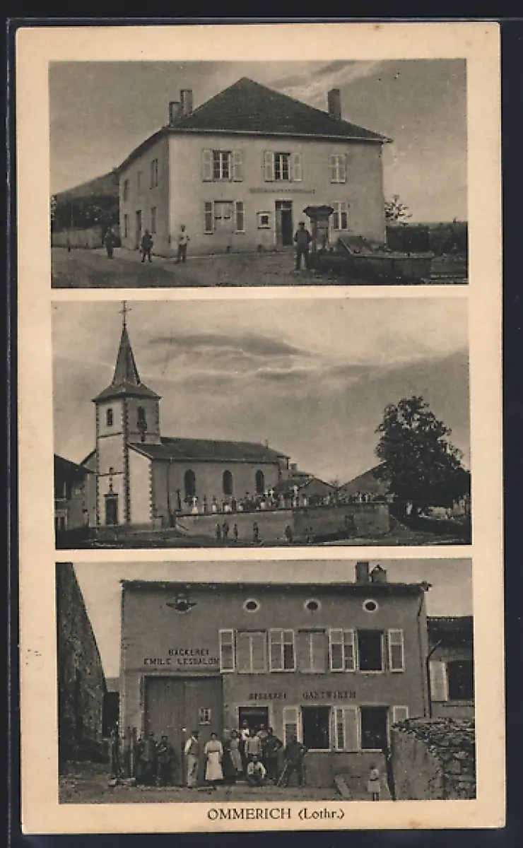 AK Ommerich /Lothr., Bäckerei Emile Lesdalon, Schul- und Gemeindehaus, Kirche