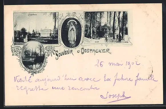 AK Oostacker, Chateau, Grotte, Eglise, Statue