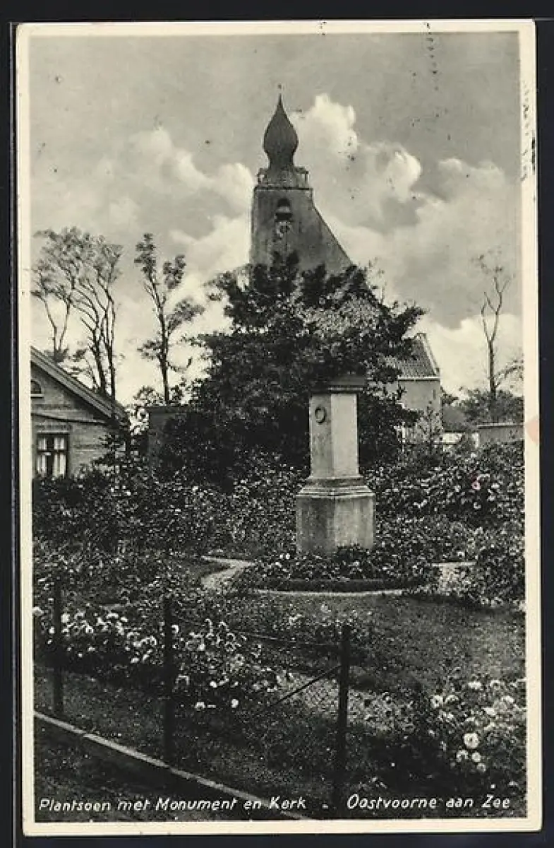 AK Oostvoorne aan Zee, Plantsoen met Monument en Kerk