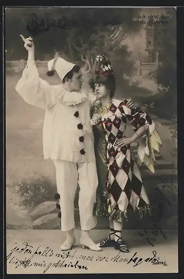 AK Operette Bajazzo, Ein Harlekin erzählt einer jungen Frau im Kostüm eine Geschichte