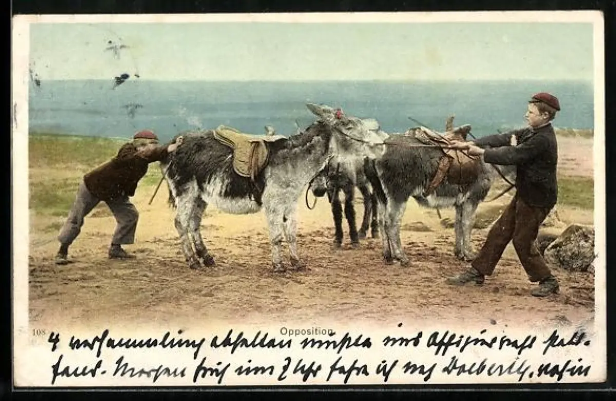AK Opposition, Zwei Knaben mit störrischen Eseln am Strand