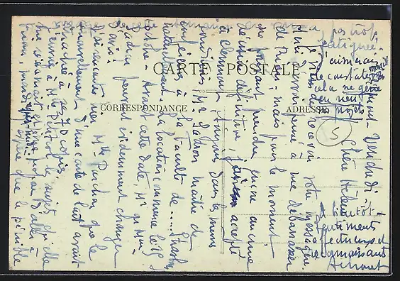 Personenbezogene Daten auf der Rückseite der Karte wurden durch blauen Textmarker unkenntlich gemacht. Die blauen Stellen sind auf die Vorderseite durchgeweicht und wirken sich negativ auf das Postkartenfoto aus