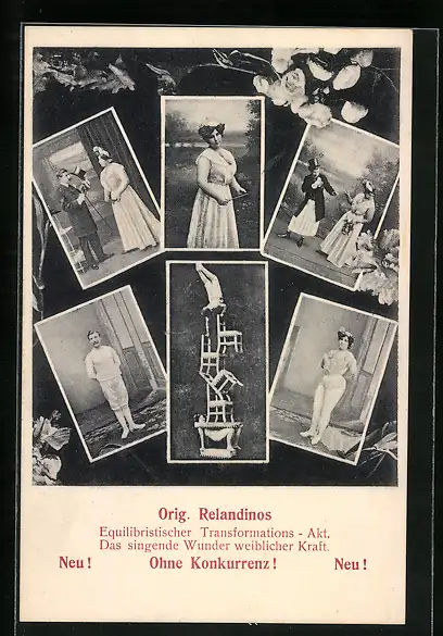 AK Orig. Relandinos, Singendes Wunder weiblicher Kraft, Artist balanciert auf Stühlen
