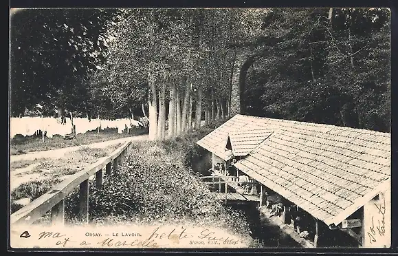 AK Orsay, Le Lavoir entouré d`arbres et d`un chemin en bordure