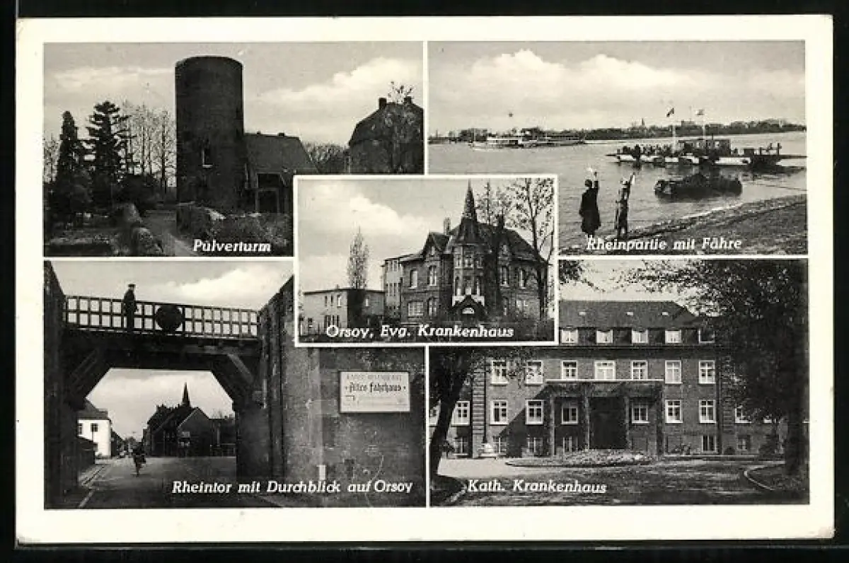 AK Orsoy, Pulverturm, Rheinpartie mit Fähre, Ev. Krankenhaus, Kath. Krankenhaus, Rheintor
