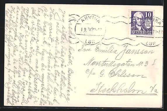 Personenbezogene Daten auf der Rückseite der Karte wurden durch blauen Textmarker unkenntlich gemacht. Die blauen Stellen sind auf die Vorderseite durchgeweicht und wirken sich negativ auf das Postkartenfoto aus