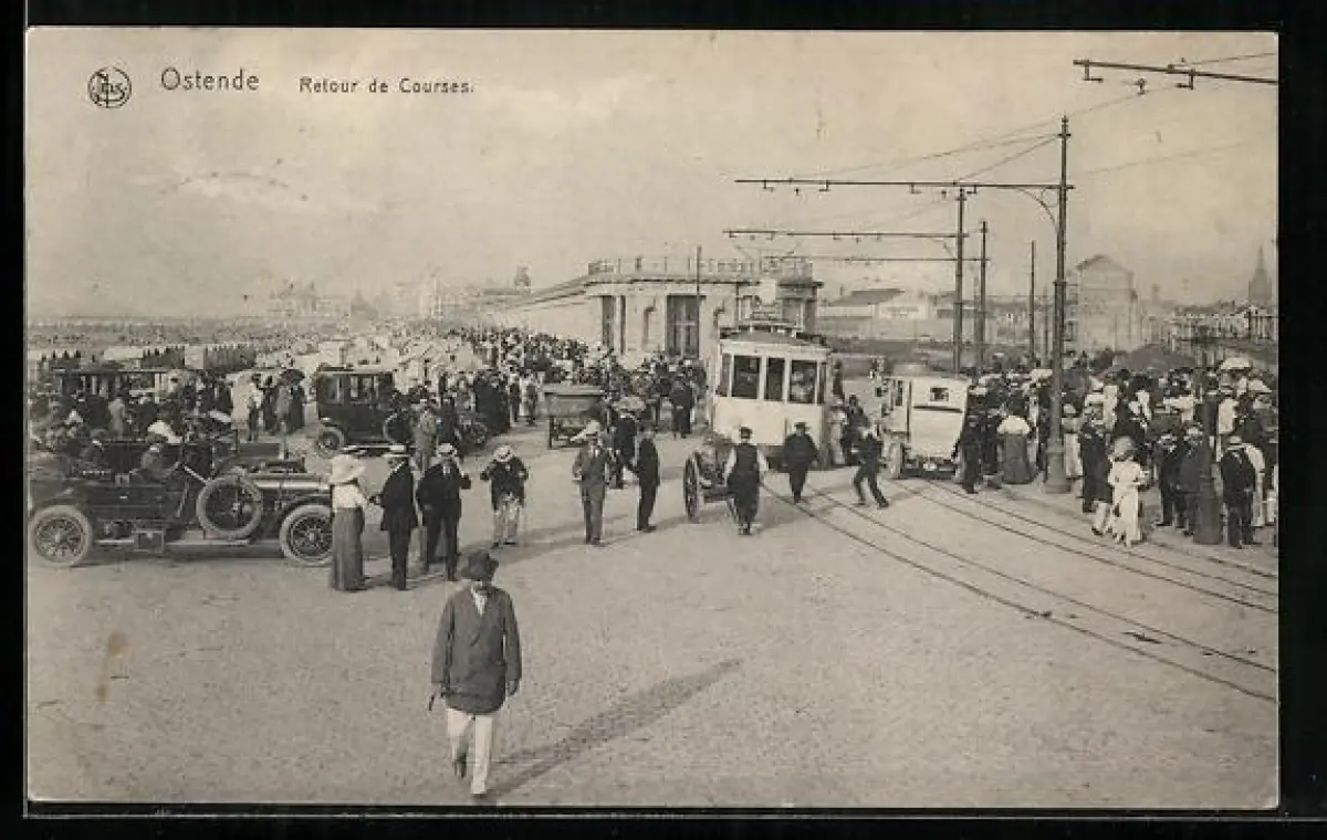 AK Ostende, Retour de Courses, Strassenbahn, Autos